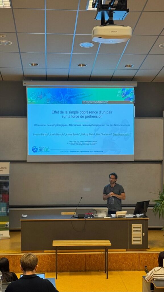 › Barbot, L. et al. : Effet de la simple coprésence d’un pair sur la force de préhension : mécanismes neurophysiologiques, déterminants neuropsychologiques et rôle des facteurs sociaux 👉 https://acaps2025.sciencesconf.org/649214.