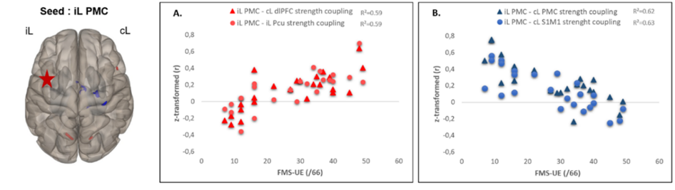 La connectivité fonctionnelle en IRM pendant une tâche sensorimotrice a été étudiée chez 25 patients ayant subi un AVC et a été corrélée au déficit moteur (échelle de Fugl-Meyer du membre supérieur, FMS-UE). Une connectivité négative du cortex prémoteur ipsilésionnel avec les régions motrices controlésionnelles (en bleu) est observée chez les patients très déficitaires et met en évidence une déconnexion. Une connectivité fonctionnelle intermodale du cortex prémoteur ipsilésionnel avec des régions non motrices (cortex préfrontal, précuneus) a été mis en evidence et peut refléter des stratégies de compensation intermodales efficaces (en rouge) (Brihmat et al., Brain Connectivity 2020).