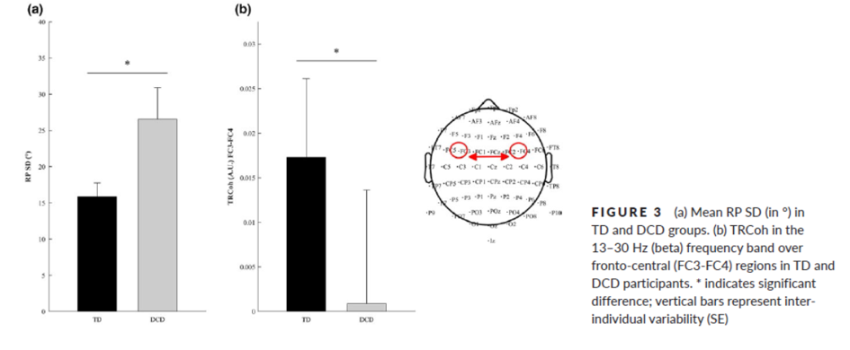 Jessica Tallet et ses collègues ont enregistré l’EEG chez des enfants présentant des troubles de la coordination du développement (DCD) et des témoins avec un développement typique (TD). Ils ont démontré que la communication interhémisphérique atypique est en corrélation avec une inhibition motrice modifiée lors de l’apprentissage d’un nouveau modèle de coordination bimanuelle dans le trouble de la coordination du développement. En effet, un contrôle moteur approprié implique l’inhibition des mouvements du miroir, qui repose sur la connectivité et la cohérence inter-hémisphériques (RP : phase relative ; TRCOh : cohérence liée à la tâche) (Blais et al., Developmental Science, 2018).